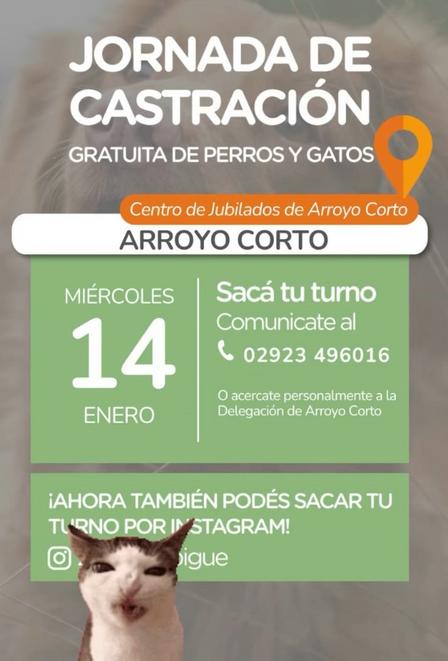 En Arroyo Corto se hará, el día miércoles 14 de enero de 2026, la castración gratuita de mascotas.
