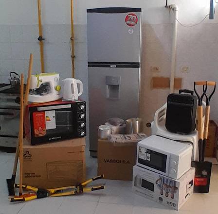 Se compró 1 heladera con freezer, 1 pava eléctrica, 2 hornos eléctricos, 1 microondas, material descartable para el Taller de Cocina, 1 máquina eléctrica de coser, 2 palas, 1 azada, 1 rastrillo, 2 tijeras de podar, 1 parlante e insumos para el Taller Carpintería.