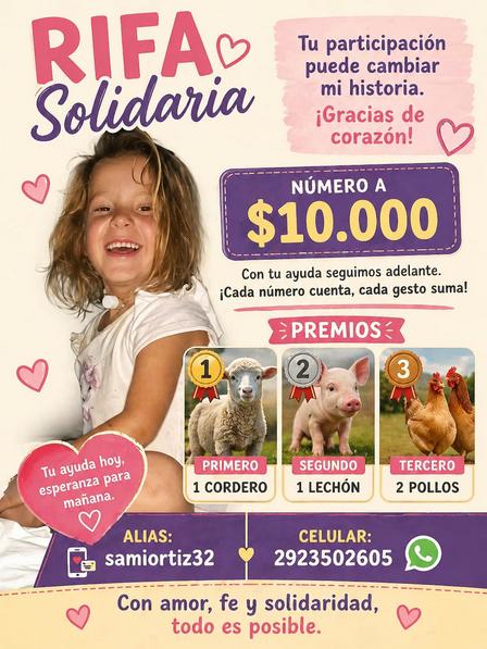 Quienes deseen colaborar pueden adquirir un número de la rifa comunicándose al 2923 50 26 05". También pueden enviar su aporte al alias: samiortiz32