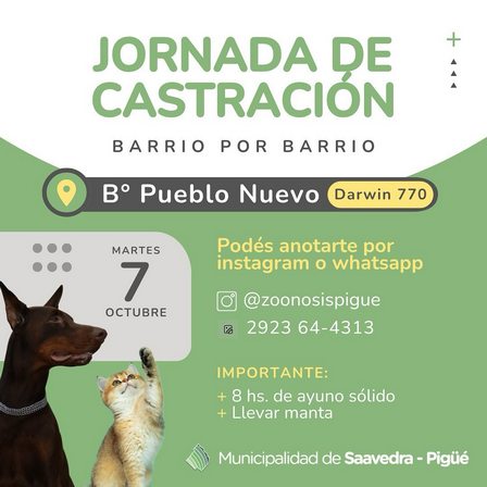 El Área de Bromatología & Zoonosis Municipal estará llevando a cabo esta práctica gratuita, mañana, martes, 7 de octubre, por la mañana, en el salón de calle Darwin esquina Conesa de la ciudad.