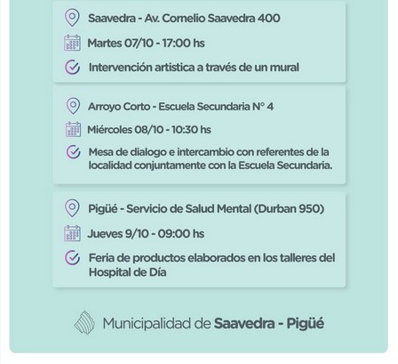 El miércoles pautaron una Mesa de Diálogo en la Escuela Secundaria Número 4 de Arroyo Corto, el jueves habrá feria en Monseñor Durban 550 de Pigüé, y las propuestas continuarán hasta el 31 de octubre.
