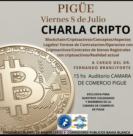 En FM de la Ciudad el Vicepresidente del Colegio de Martilleros de Bahía Blanca indicó “la charla de criptomonedas es el viernes 8 a las 15.00 horas en la Cámara de Comercio de Pigüé”.