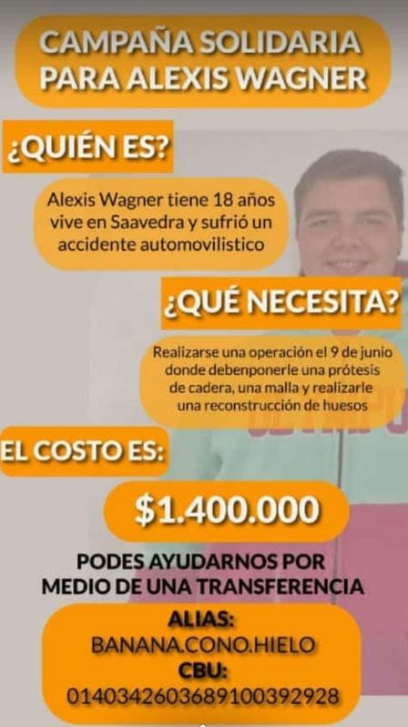 Alexis Wagner sufrió un accidente automovilístico, de allí que, están recolectando fondos para que el joven pueda realizarse una operación que tiene un costo de 1.400.000 pesos.