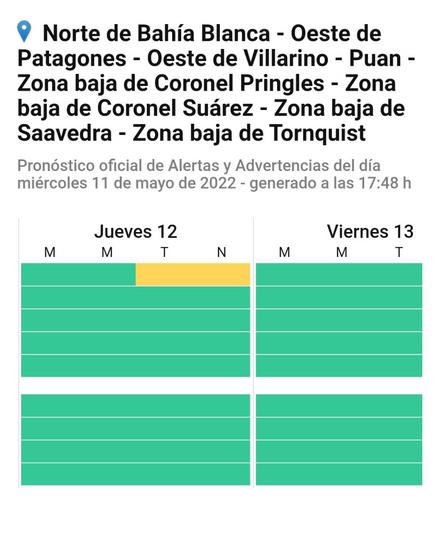 De acuerdo al Servicio Meteorológico Nacional se trata de un Alerta Amarillo, ya que, “el área será afectada por tormentas, pudiendo ser algunas localmente fuertes, acompañadas de intensas ráfagas, fuerte actividad eléctrica, ocasional caída de granizo, y abundante caída de agua en cortos períodos.