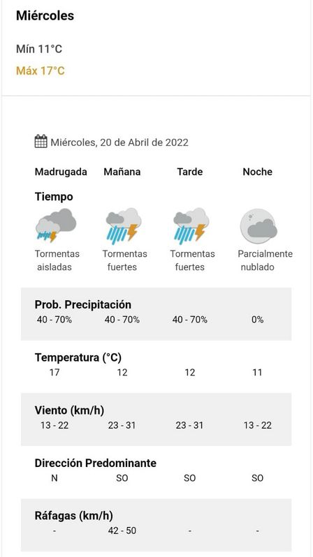 El área será afectada por lluvias y tormentas de variada intensidad, pudiendo ser algunas fuertes, acompañadas de intensas ráfagas, fuerte actividad eléctrica, ocasional caída de granizo, y abundante caída de agua en cortos períodos.