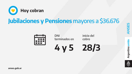 Las sucursales bancarias habilitadas atenderán por ventanilla a jubilados, jubiladas, pensionados y pensionadas con documentos terminados en 4 y 5 cuyos haberes superen la suma de 36.676 pesos.