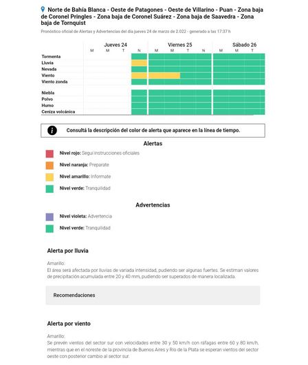 En un comunicado el Área de Prensa expresa que "la Municipalidad de Saavedra (Pigüé) – Defensa Civil informan respecto al temporal de lluvia y viento registrado en el distrito desde el día de ayer que al momento se registran gran cantidad de árboles caídos en las localidades y daños materiales producto de la caída de los mismos y del fuerte viento. Bomberos, empleados y funcionarios municipales, personal policial, de la Coop. Eléctrica y Defensa civil trabajan en la remoción de árboles y ramas y despeje de calles por cables cortados y ubicados en aceras.