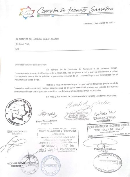 La Comisión de Fomento, en su cuenta en las redes sociales, manifestó "días atrás enviamos una nota al Director del Hospital Miguel Svarch, Dr. Juan Piña, haciéndole llegar una solicitud que acompañan varias instituciones de nuestra ciudad con respecto a la posibilidad de atención en el citado nosocomio de un médico especialista en Traumatología y otro en Kinesiología".