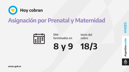 Las titulares de la Asignación por Prenatal y Asignación por Maternidad con documentos terminados en 8 y 9 perciben hoy, viernes, su prestación.