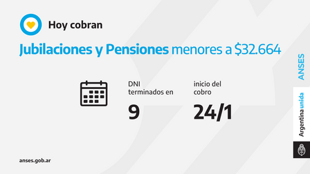 Las sucursales bancarias habilitadas atenderán por ventanilla a jubilados, jubiladas, pensionados y pensionadas con documentos terminados en 9 cuyos haberes no superen la suma de 32.664 pesos