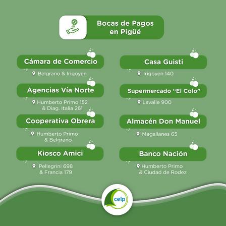 En el caso de los puntos de pago en la ciudad son la Cámara de Comercio, el Banco Nación, Kiosco Amici, Agencias Vía Norte y Luz del Norte, Cooperativa Obrera, Minimercado El Colo, Casa Giusti y Mercado Don Manuel.