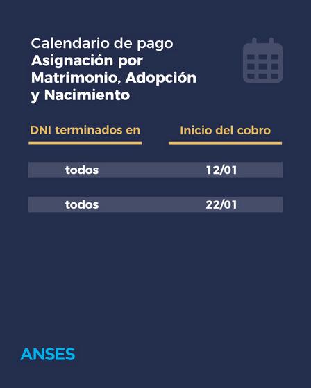 Hoy, lunes, 12 de enero de 2026, se realizan los abonos a las Asignaciones por Adopción, Matrimonio y Nacimiento para las distintas terminaciones de DNI.