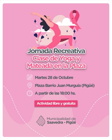 La clase de yoga, con mateada, tendrá lugar en la Plaza del Barrio Juan Murguía de Pigüé el día martes 28 de octubre de 2025 a partir de las 18.00 horas.