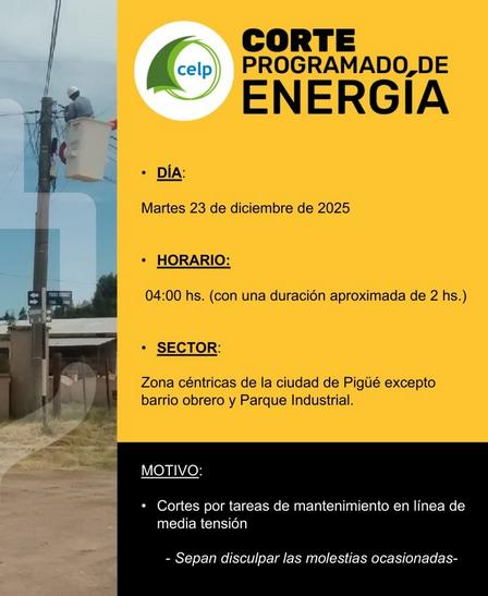 La Cooperativa Eléctrica de Pigüé realizará trabajos de mantenimiento en la línea de media tensión produciendo un corte en la zona céntrica, excepto el Barrio Ángel Monasterio, el Barrio Ducos, y el Parque Industrial.