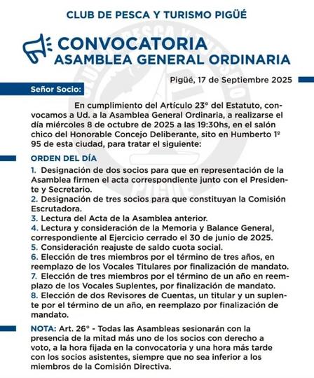 El día 8 de octubre, a las 19.30 horas, se hará la Asamblea General Ordinaria del Club de Pesca y Turismo de Pigüé.