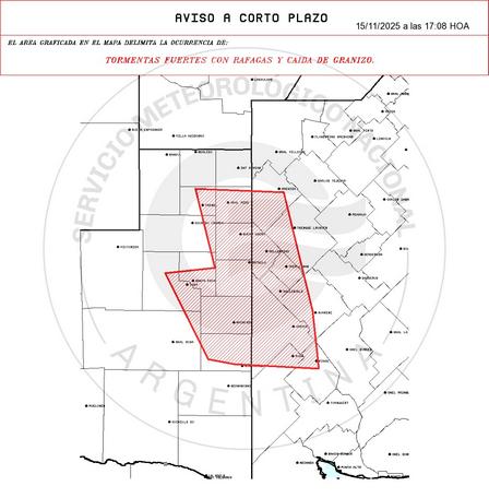 Emitido luego de las 17.00 horas el aviso del Servicio Meteorológico Nacional advierte acerca de posibles tormentas fuertes para esta tarde.