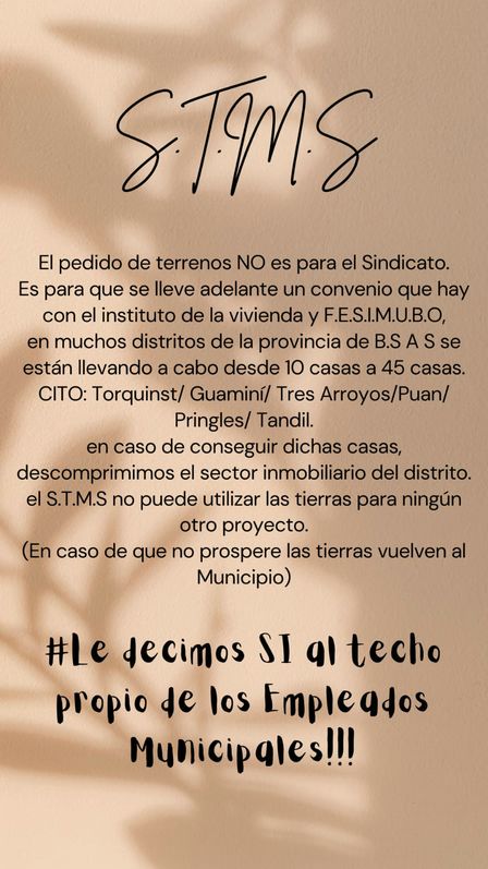 Antes el Sindicato de los Trabajadores Municipales del Partido de Saavedra consideró que "el pedido de terrenos no es para el Sindicato. Es para que se lleve adelante un convenio que hay con el Instituto de la Vivienda y FESIMUBO en muchos distritos de la Provincia de Buenos Aires. Se están llevando a cabo desde 10 casas a 45 casas. Cito Tornquist / Guaminí / Tres Arroyos / Puan / Pringles / Tandil. En caso de conseguir dichas casas descomprimimos el sector inmobiliario del distrito. El STMS no puede utilizar las tierras para ningún otro proyecto. (En caso que no prospere las tierras vuelven al Municipio".