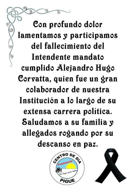 El mensaje dice 'Con profundo dolor lamentamos y participamos del fallecimiento del Intendente mandato cumplido Alejandro Hugo Corvatta, quien fue un gran colaborador de nuestra institución a lo largo de su extensa carrera política.