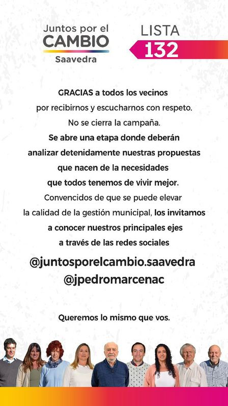 El parte de prensa expresa que "la lista encabezada por Juan Pedro Marcenac cierra la campaña presentando 9 ejes de gestión a través de sus redes sociales. En un mensaje a través de sus redes agradece a todos los vecinos por el buen recibimiento que tuvo su propuesta y agrega: "Nuestra propuesta nace de las necesidades que recogimos durante dos años de trabajo y del convencimiento de que se puede gestionar mejor, se puede mejorar la calidad de la gestión municipal para atraer inversiones y mejorarle la vida a los vecinos.