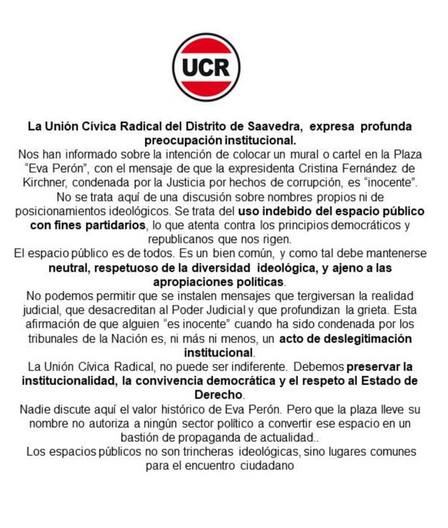 En un comunicado la Unión Cívica Radical hizo públicas las razones por las que marcaba su disidencia respecto de la actividad que vienen concretándose por estas horas en el espacio público de calle Sarmiento esquina Montevideo de Pigüé.
