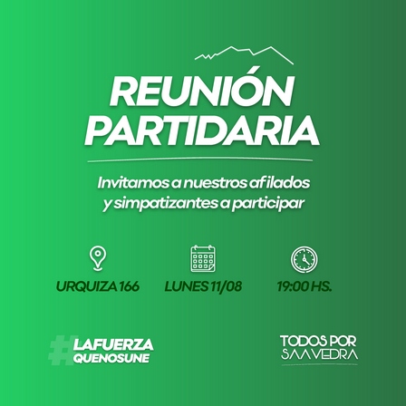 La agrupación politica del distrito estará encontrándose, el lunes, 11 de agosto, a las 19.00 horas, en calle Urquiza 166 de Pigüé.