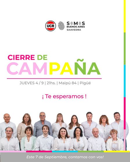 A partir de las 21.00 horas, el jueves, 4 de septiembre de 2025, los candidatos del Distrito de Saavedra que integran la Lista de Somos realizarán el cierre de la campaña electoral previa a los comicios del día domingo.