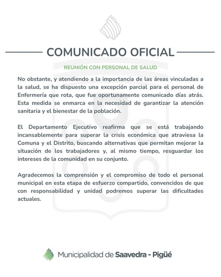 En un comunicado expusieron el informe de lo abordado en la cita mantenida esta mañana con operarios del ámbito sanitario del Distrito de Saavedra.