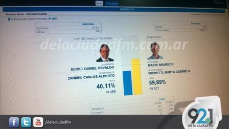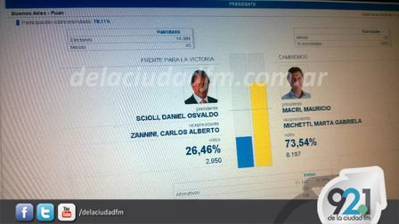 En el vecino distrito suarense el triunfo de la fórmula Mauricio Macri - Gabriela Michetti se dio por 59.89 por ciento sobre 40.11 por ciento.