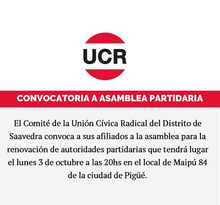 La Unión Cívica Radical de Distrito de Saavedra está convocando a quienes quieran sumarse a la Asamblea para renovar autoridades partidarias.