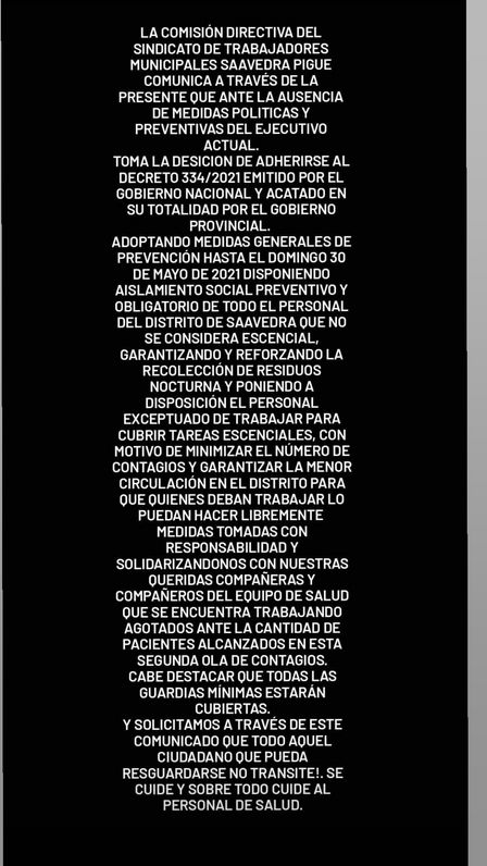 El comunicado asevera que "la Comisión Directiva del Sindicato de Trabajadores Municipales Saavedra Pigüé comunica a través de la presente que ante la ausencia de medidas políticas y preventivas del ejecutivo actual.
