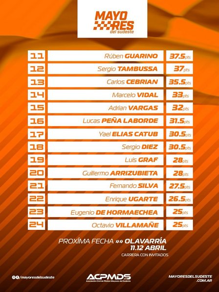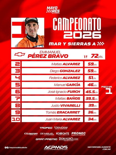 En el cuarto puesto marcha Federico Álvarez, el quinto lugar es ocupado por Manuel García, y está sexto Ignacio Furch con 45.5 puntos.