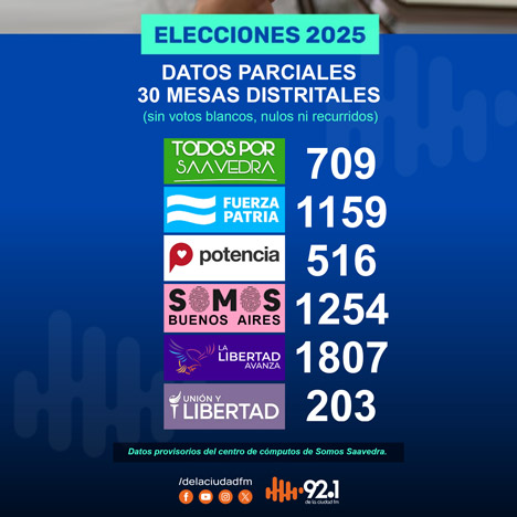 Con treinta mesas escrutadas, ya hay resultados parciales Escrito por Martín Arriaga Zugasti el 07 Septiembre 2025. Publicado en Noticias Segui nuestros resultados minuto a minuto en nuestras redes sociales. < Anterior Siguiente >