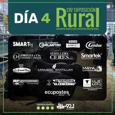Hoy, domingo, en el cuarto día de la muestra más grande del campo, las novedades están en www.delaciudadfm.com.ar/envivo
