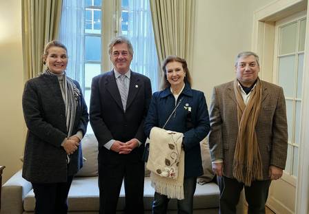 La titular de la Cancillería Argentina, Diana Elena Mondino llegó al despacho de Nicolás Pino para participar de un encuentro junto a Carlos Enciso y a Helena Felip.