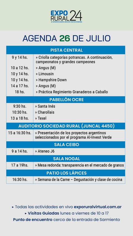El Regimiento de Granaderos a Caballo hará una práctica, en el Auditorio de la Sociedad Rural se presentarán los proyectos seleccionados por un programa internacional, se reunirá el Ateneo J6, se prevé un encuentro de la Mesa Redonda sobre la transparencia en el mercado de granos, seguirán las degustaciones por la Semana de las Carnes, y habrá en el Pabellón Ocre más juras.