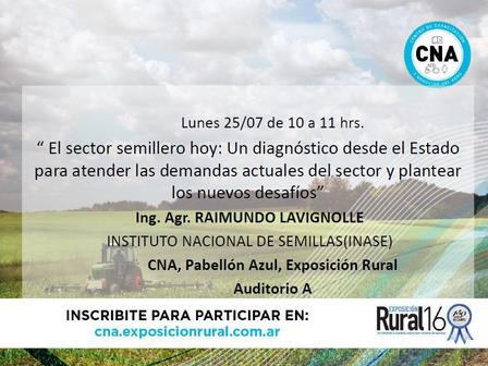 El lunes de la semana próxima, en el Pabellón Azul de la Exposición Rural, tendrá lugar una disertación sobre 'El sector semillero hoy: un diagnóstico desde el Estado para atender las demandas actuales del sector y plantear los nuevos desafíos'.
