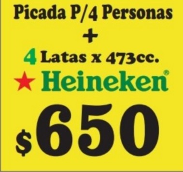 Por 650 pesos es posible conseguir las cuatro latas de cerveza rubia Heineken de 473 centímetros cúbicos y la tabla de picada para cuatro personas.
