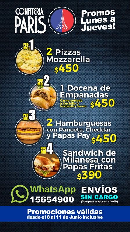 Confitería París tiene envíos a domicilio con pizzas, empanadas, hamburguesas, y sándwiches en promoción.