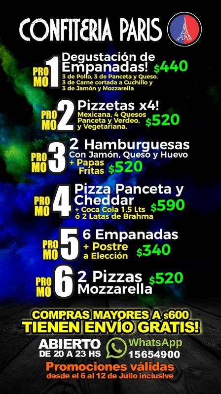 Confitería París presenta más promos especiales con hamburguesas, pizzas, y empanadas con pedidos al 2923 65 49 00.