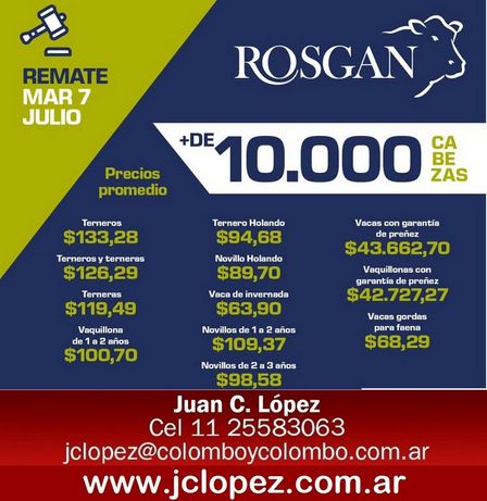 Colombo y Colombo dio a conocer los precios promedios del remate televisado Rosgan de ayer comunicando a su vez que la próxima subasta se hará el 31 de julio.