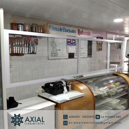 Para una carnicería se realizó el trabajo a medida con la colocación de un cobertor de aluminio, sus compartimentos, y el vidriado especialmente diseñado a medida.