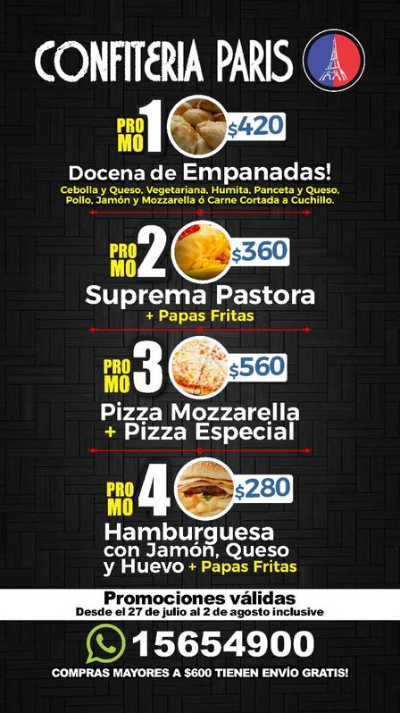 Confitería París tiene opciones en pizzas, hamburguesas, supremas, y empanadas, con pedidos al 2923 65 49 00