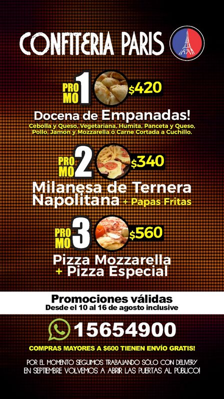Confitería París tiene opciones en pollo a la pizza, pizzas, hamburpizzas, pizzetas, y empanadas, con pedidos al 2923 65 49 00