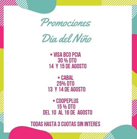 Con las tarjetas VISA del Banco de la Provincia de Buenos Aires, Coopeplus, y MasterCard, hay rebajas especiales en estos días previos al Día del Niño con tres cuotas sin interés.