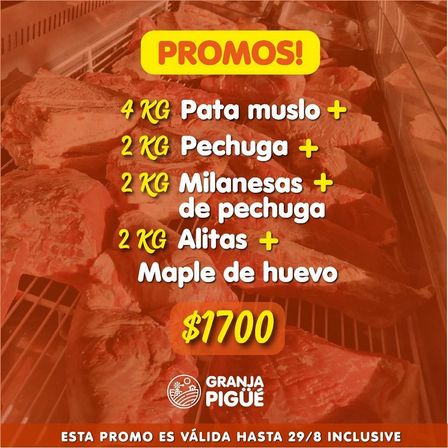 4 kilos de pata muslo más 2 kilos de pechuga, más 2 kilos de milanesas de pechuga, más 2 kilos de alitas, más un maple de huevos, cuestan 1.700 pesos.