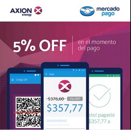 El mensaje dice "Axion y Mercado Pago te traen más beneficios. 5 por ciento de descuento para todos los combustibles cargando con la aplicación de Mercado Pago en tu celular. Es válida del lunes 24 al domingo 30 de agosto de 2020 inclusive".