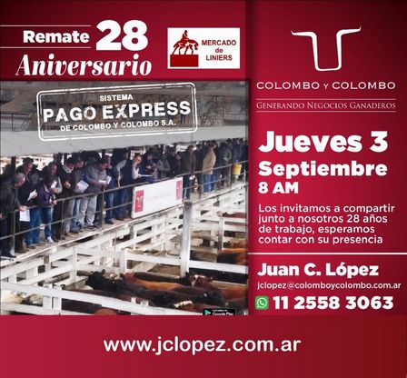 Colombo y Colombo tendrá su Remate Aniversario en el Mercado de Liniers, el jueves 3 de septiembre, a partir de las 8.00 horas.