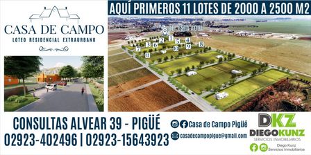 Es la venta de lotes desde 2.000 metros cuadrados, en Casa de Campo Pigüé, contando, los tres primeros, con un precio promocional especial, registrando vista a las sierras, arroyos y un entorno de naturaleza único, ubicados a minutos del centro comercial, sobre Ruta 67, cerca de Ruta Nacional 33.