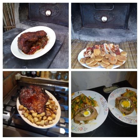 Para el sábado a la noche cocinan peceto mechado al horno de leña con ensalada rusa clásica con mayonesa casera, mientras que, el domingo al mediodía, el p lato es falda deshuesada al horno de barro con salsa criolla y papas bravas, o bien, pechito de cerdo a la barbacoa al horno de barro con papas aplastadas.