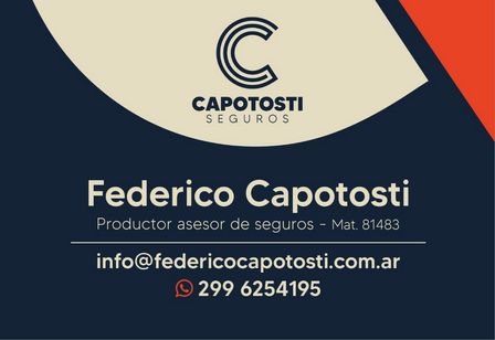 En Pigüé es posible consultar con Federico Capotosti Productor Asesor de Seguros a través del contacto 299 62 54 195 o bien escribiendo a Esta dirección de correo electrónico está siendo protegida contra los robots de spam. Necesita tener JavaScript habilitado para poder verlo.